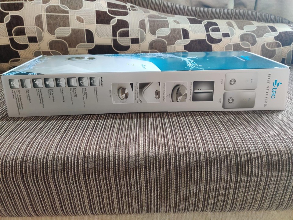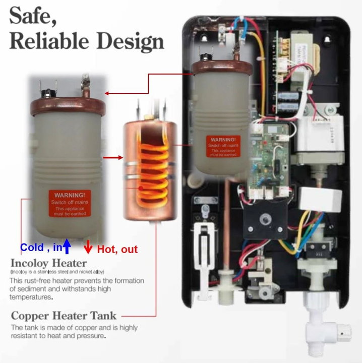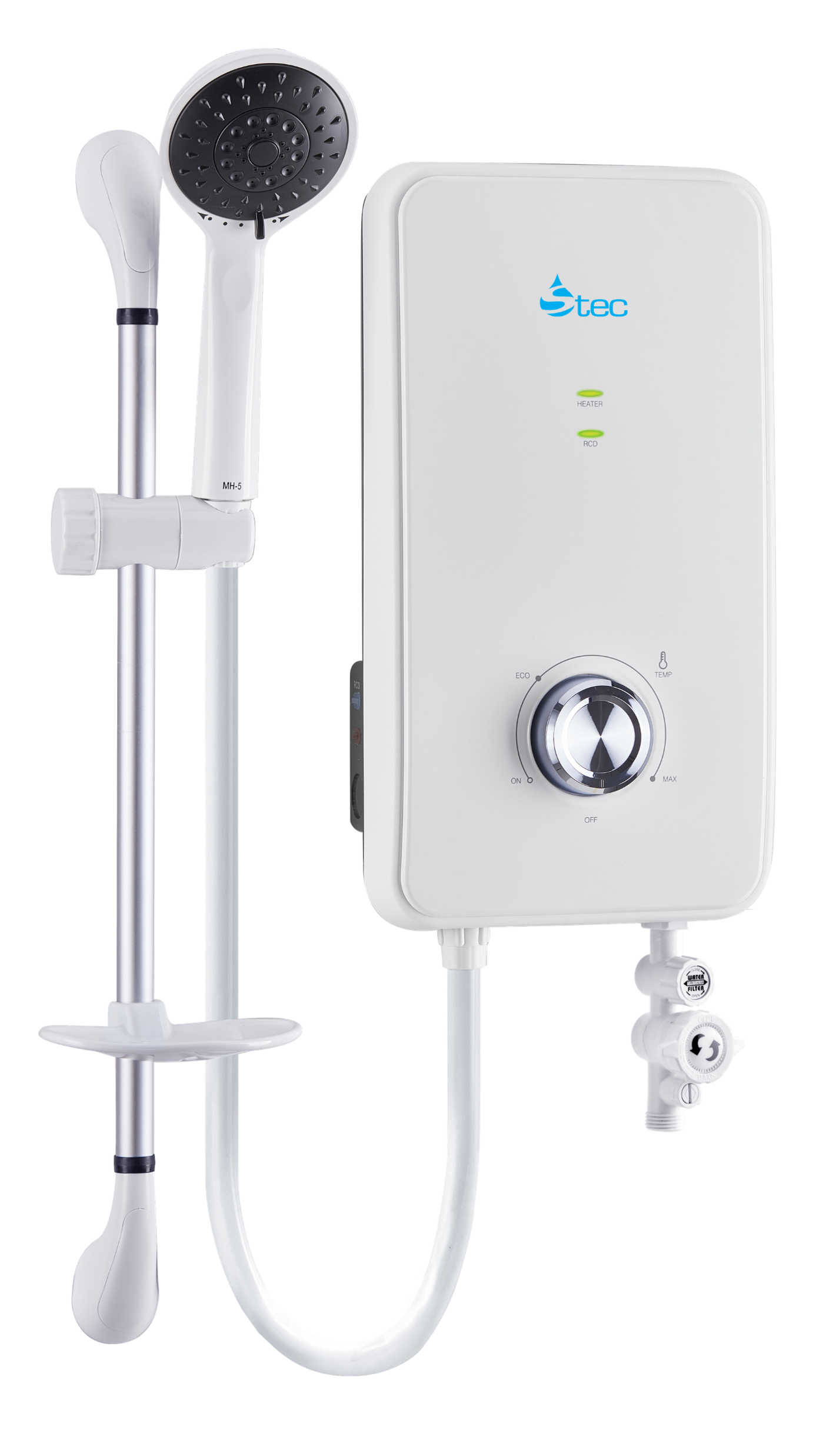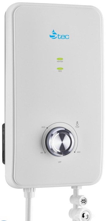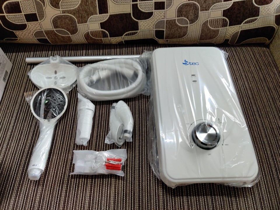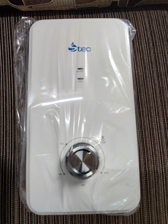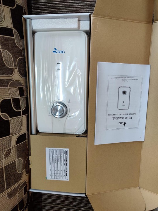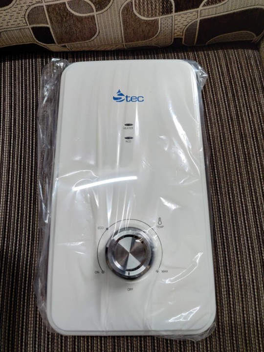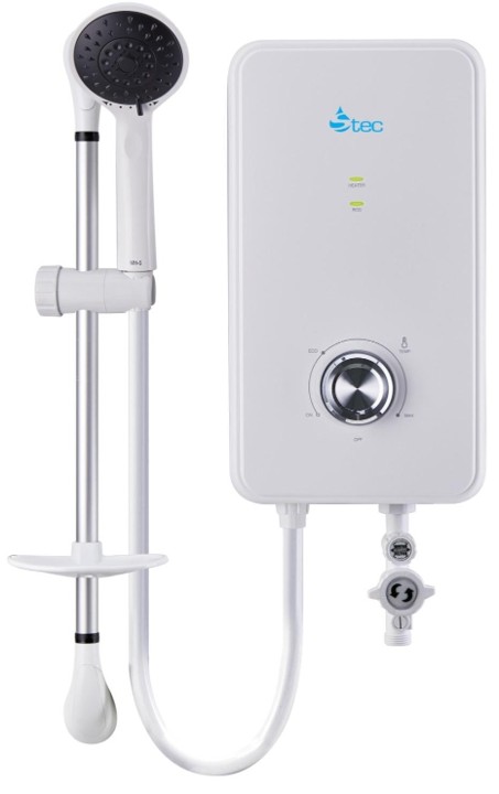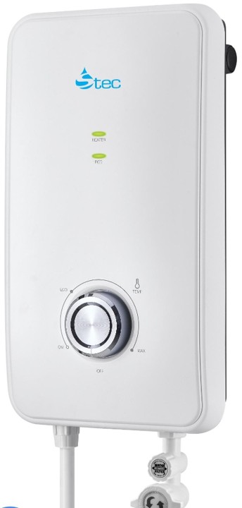 Modern instant shower water heater with sleek white design. Features include: instant heating technology, adjustable temperature control, safety cut-off protection, and energy-efficient operation. Perfect for bathrooms of all sizes. Easy installation with included mounting kit.
